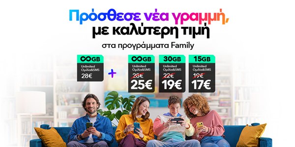 Τα νέα προγράμματα Family προσφέρουν μειωμένη τιμή για κάθε νέα επιπλέον γραμμή κινητής σε όλους τους νέους και υφιστάμενους συνδρομητές που συνδυάζουν σταθερή και κινητή!