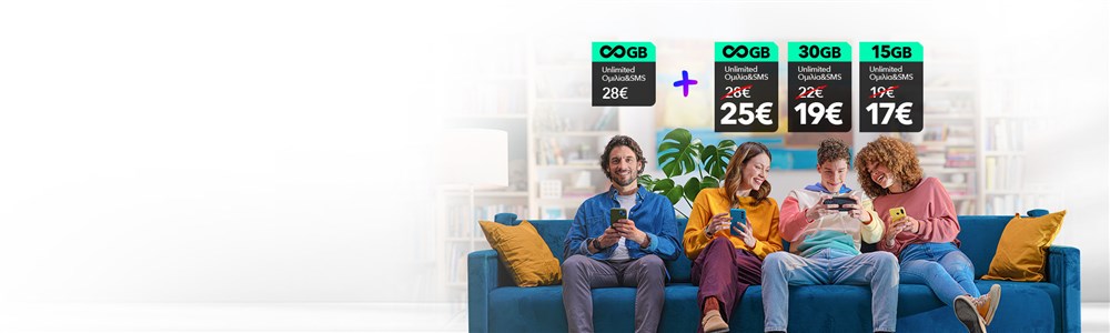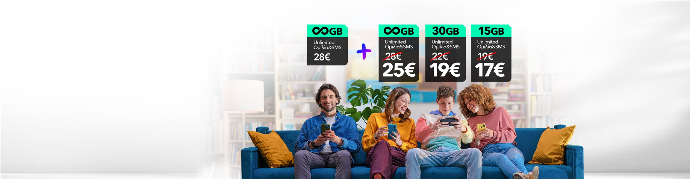 Στο σχήμα μπορούν να συνδυαστούν διαφορετικά προγράμματα! Για παράδειγμα μπορείς να επιλέξεις το πρόγραμμα Unlimited Ομιλία&SMS+ 30GB στην 1η γραμμή και το Unlimited All στην 2η γραμμή και να επωφεληθείς από τις προνομιακές τιμές.
